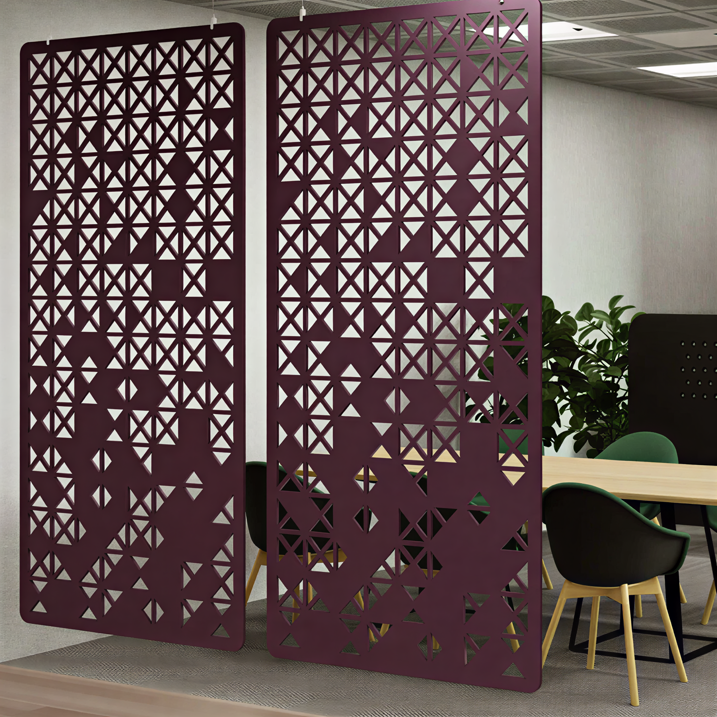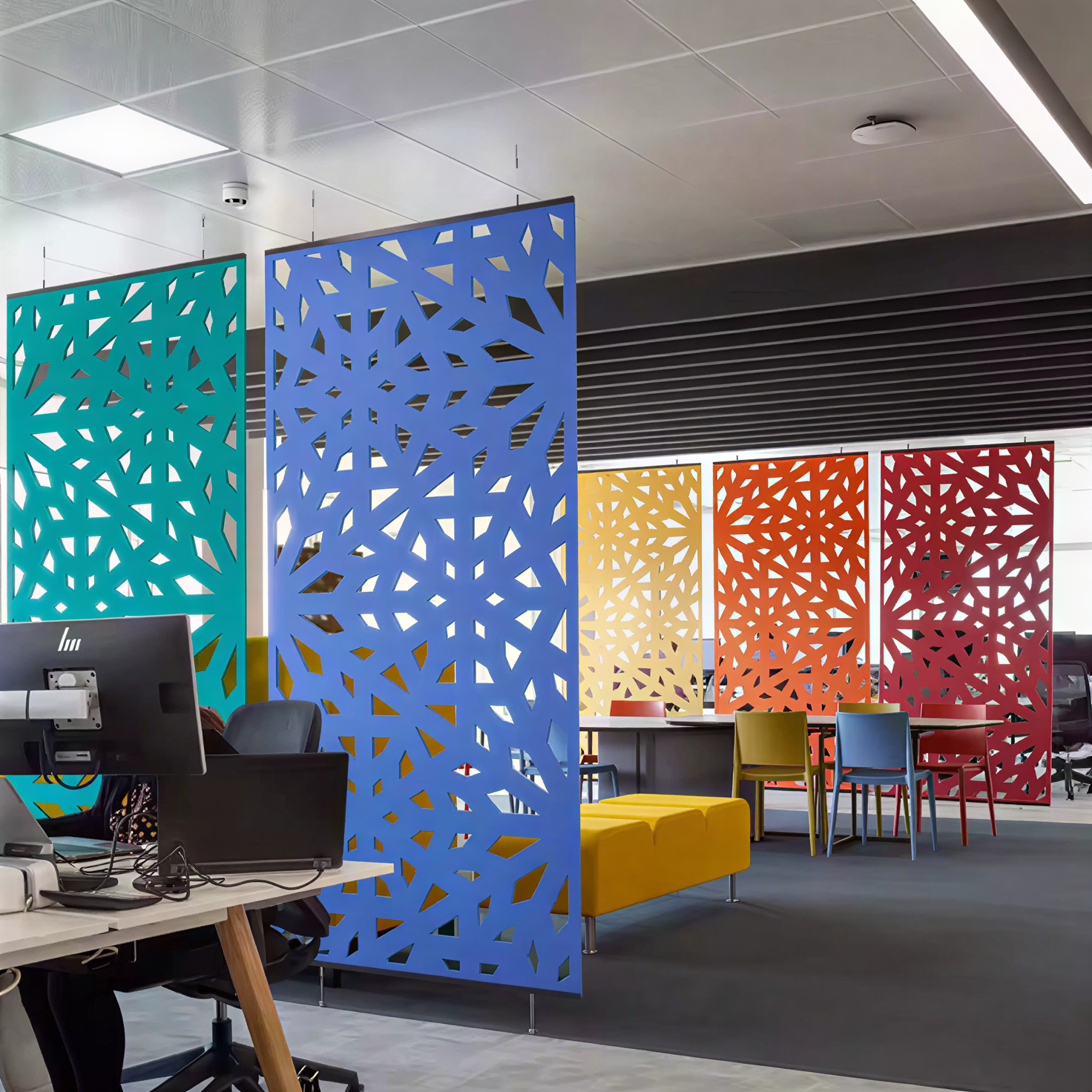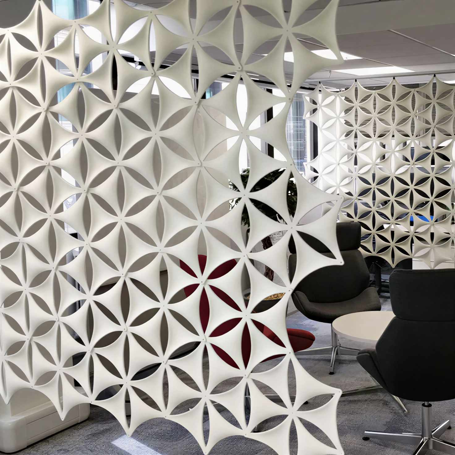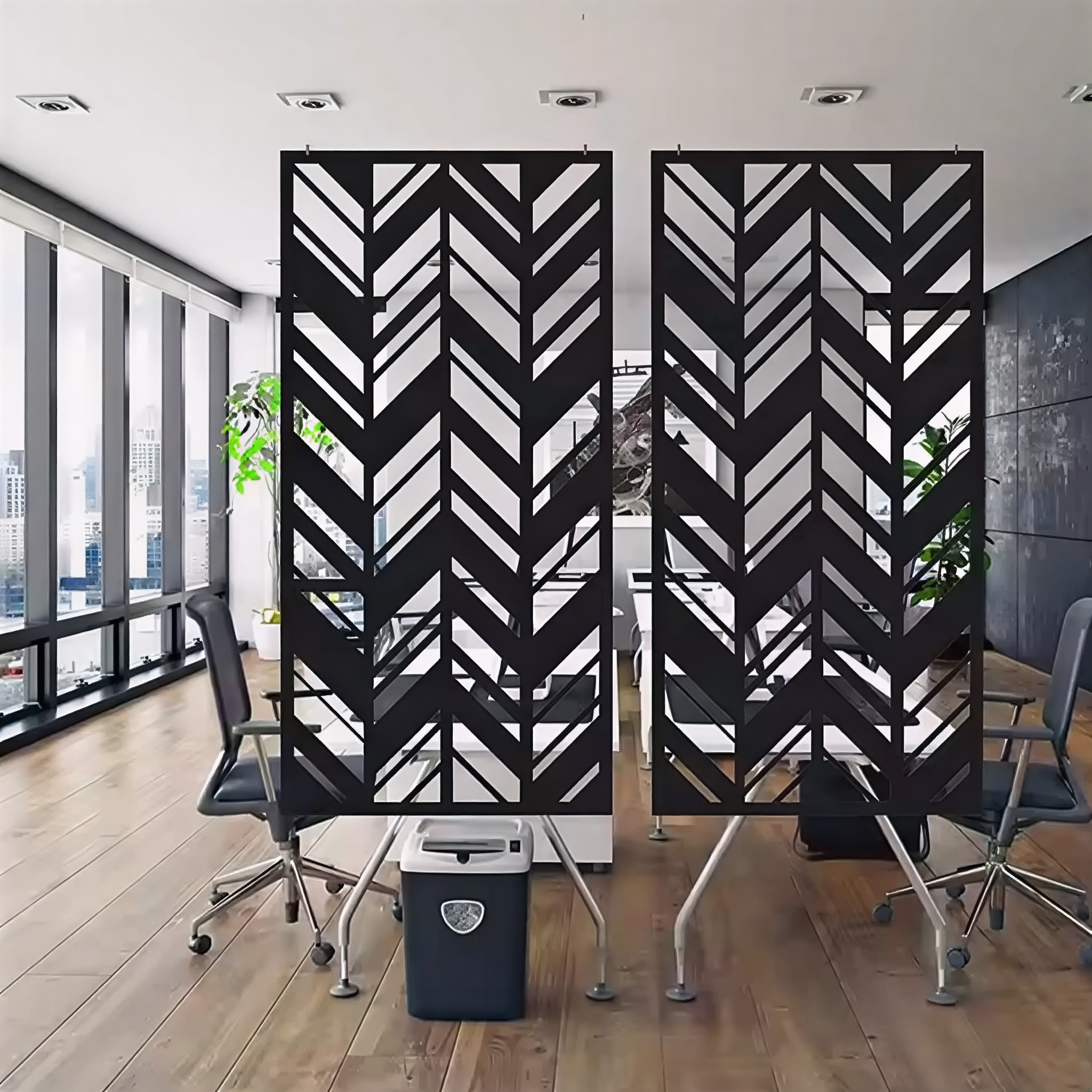 Благодаря сквозным узорам панели формируют уникальную игру света и тени, наполняя пространство динамичными световыми акцентами.